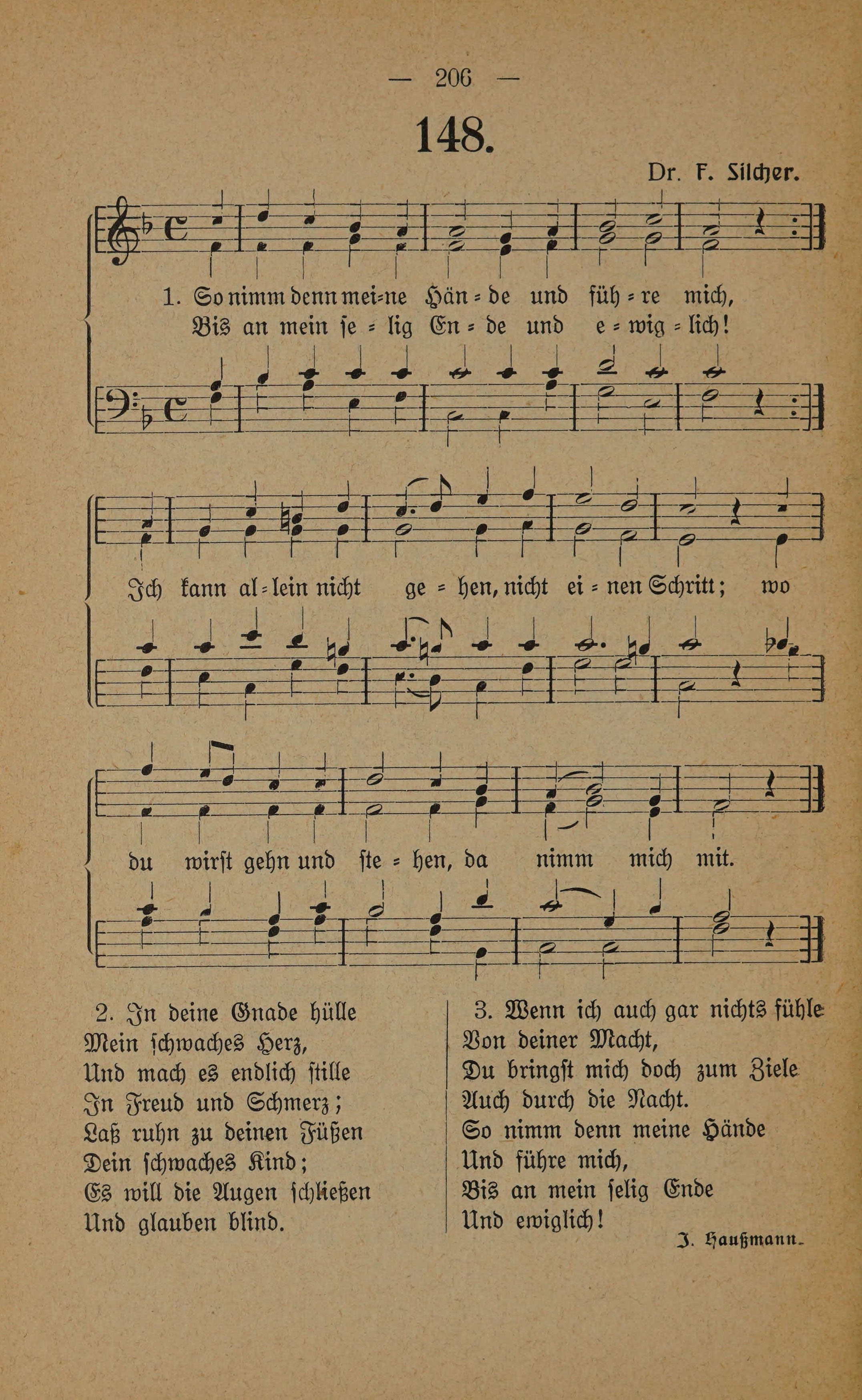 Die Melodie zu diesem Lied erschien 1843 in Silchers Sammlung “Zwölf Kinderlieder für Schule und Haus”, zwei- drei- und vierstimmig komponiert, dort noch mit dem Text “Wie könnt ich ruhig schlafen in dunkler Nacht, wenn ich, o Gott und Vater, nicht dein gedacht?”, einem Nachtgebet für Kinder von Agnes Franz. Die Melodie wurde später durch das Lied von Julie Hausmann “So nimm denn meine Hände” weltbekannt.
